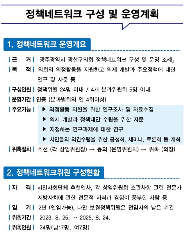 광산구의회 정책네트워크 1기 구성 및 운영계획