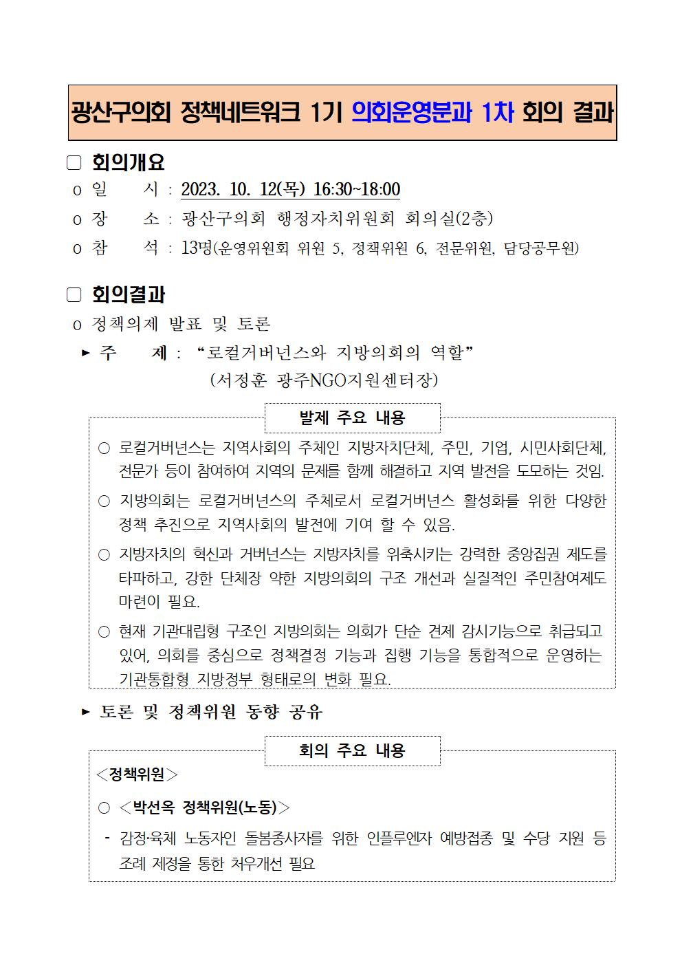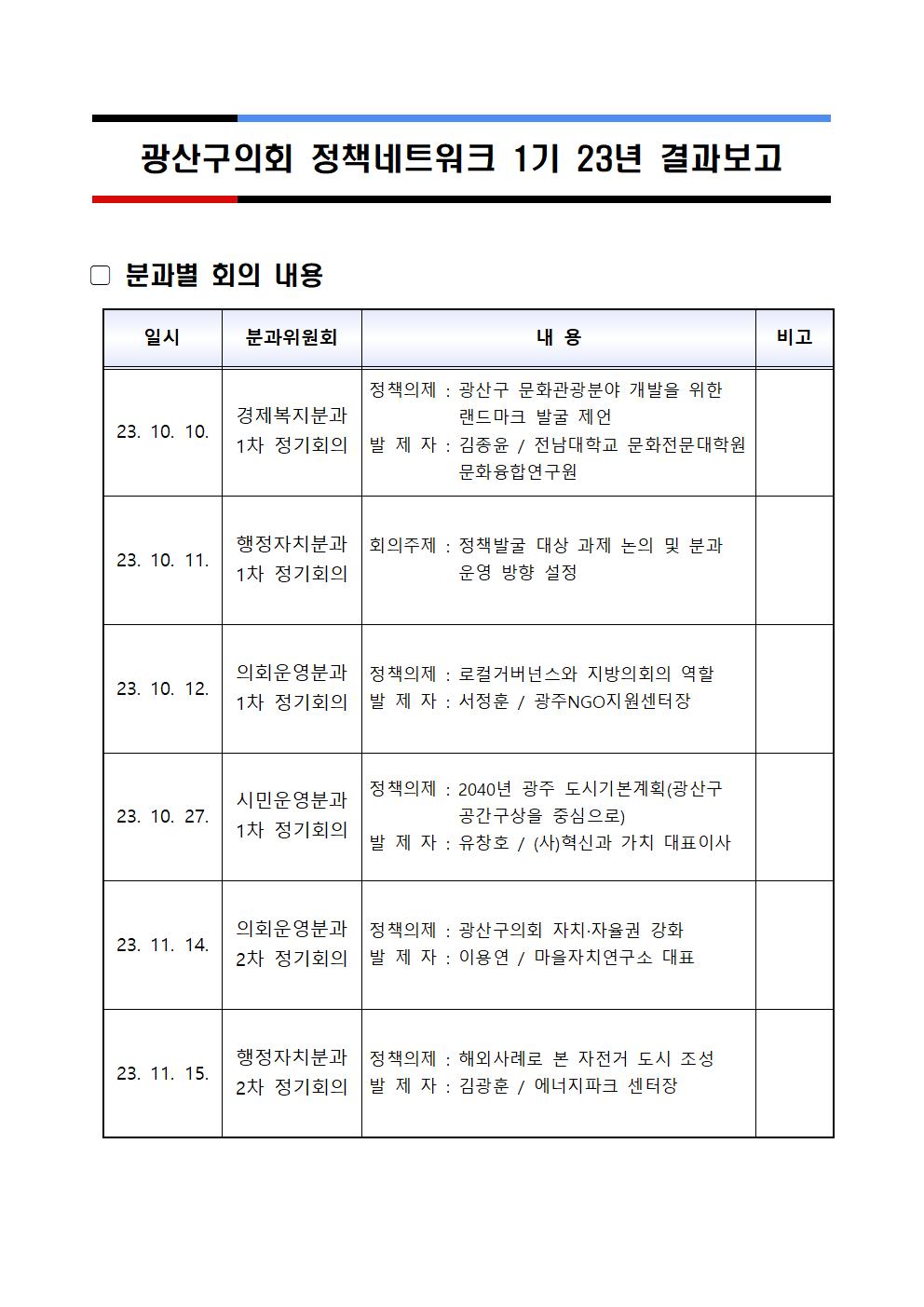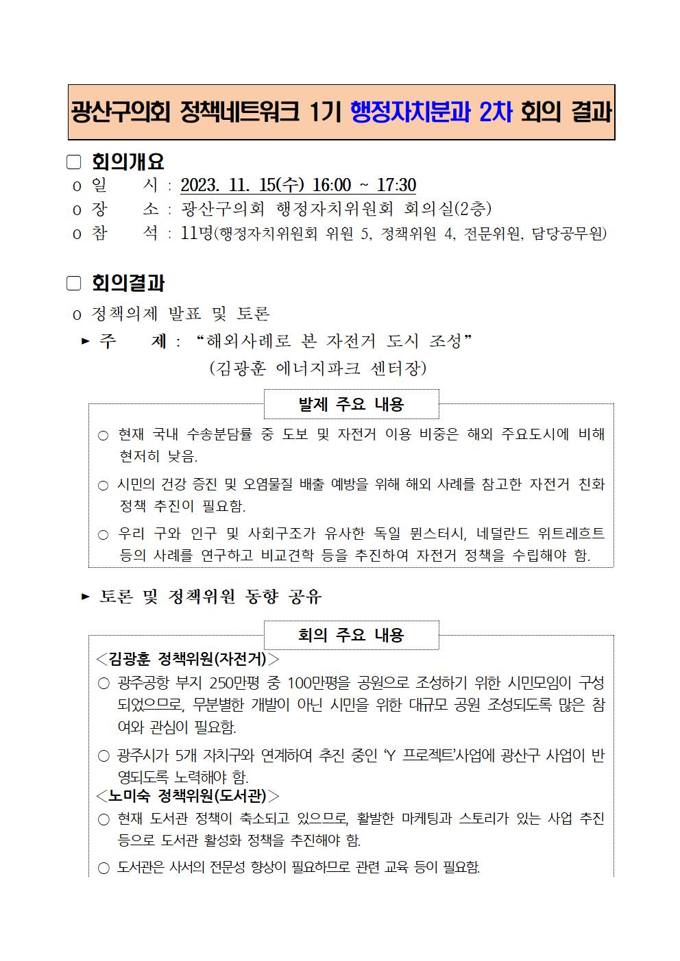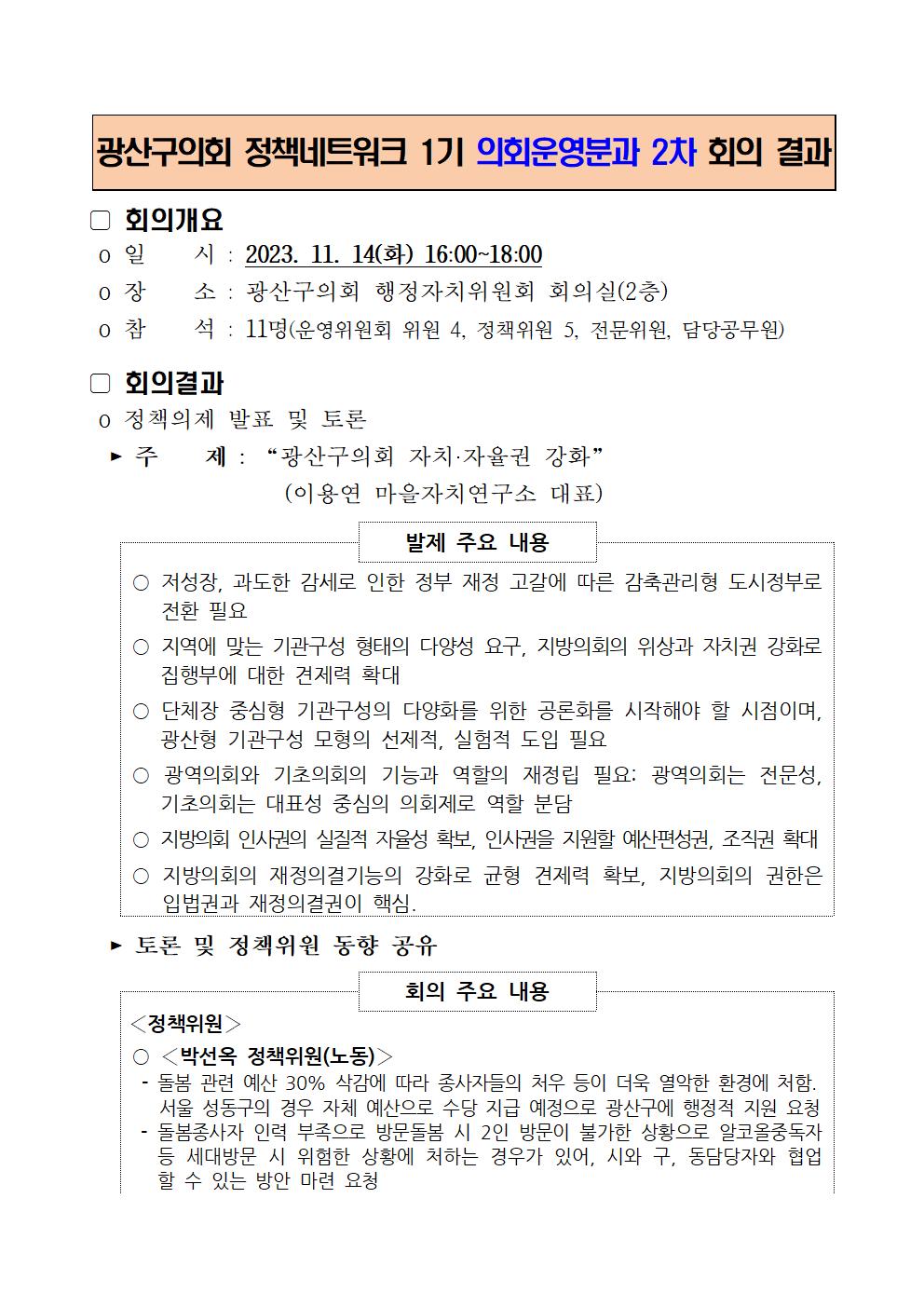 2023년 광산구의회 정책네트워크 1기 활동 결과