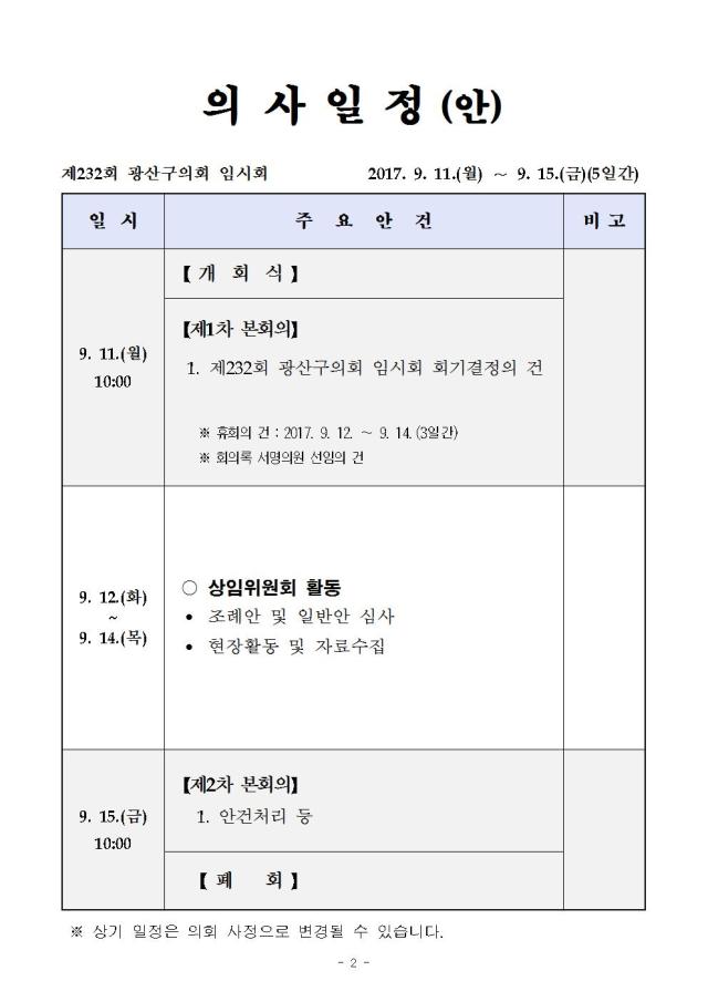 제232회 광산구의회 임시회 의사일정(안)