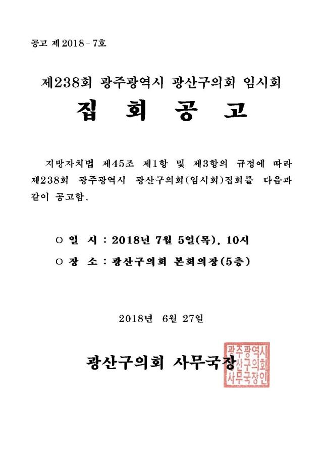 제238회 광주광역시 광산구의회 임시회 집회 공고