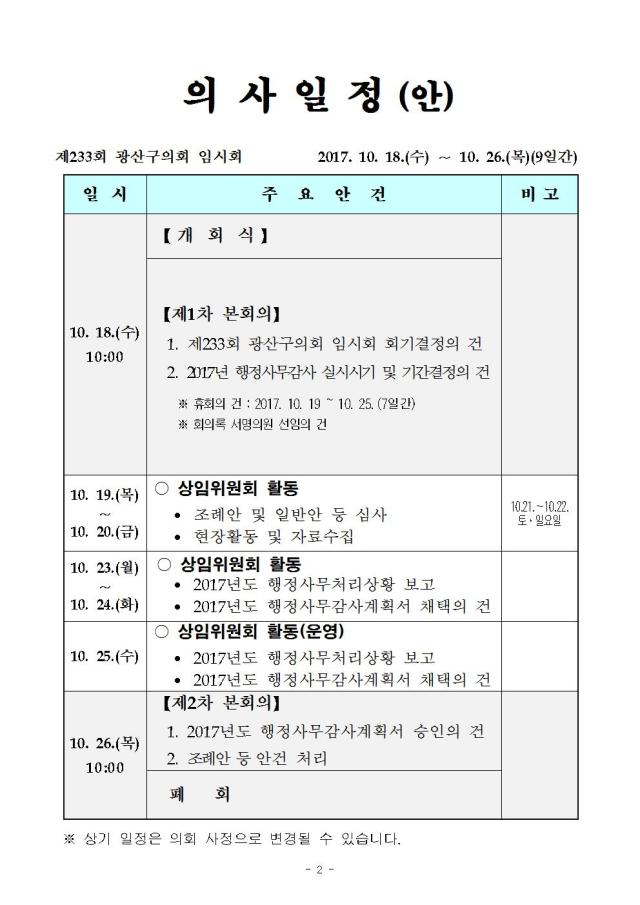 제233회 광산구의회 임시회 의사일정(안)