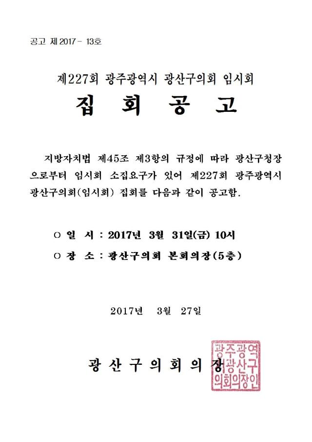 제227회 광주광역시 광산구의회 임시회 집회 공고